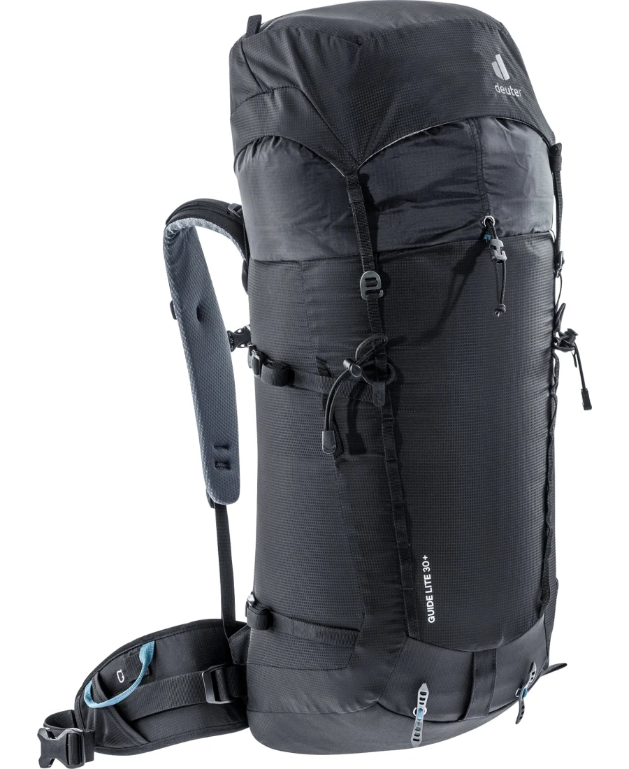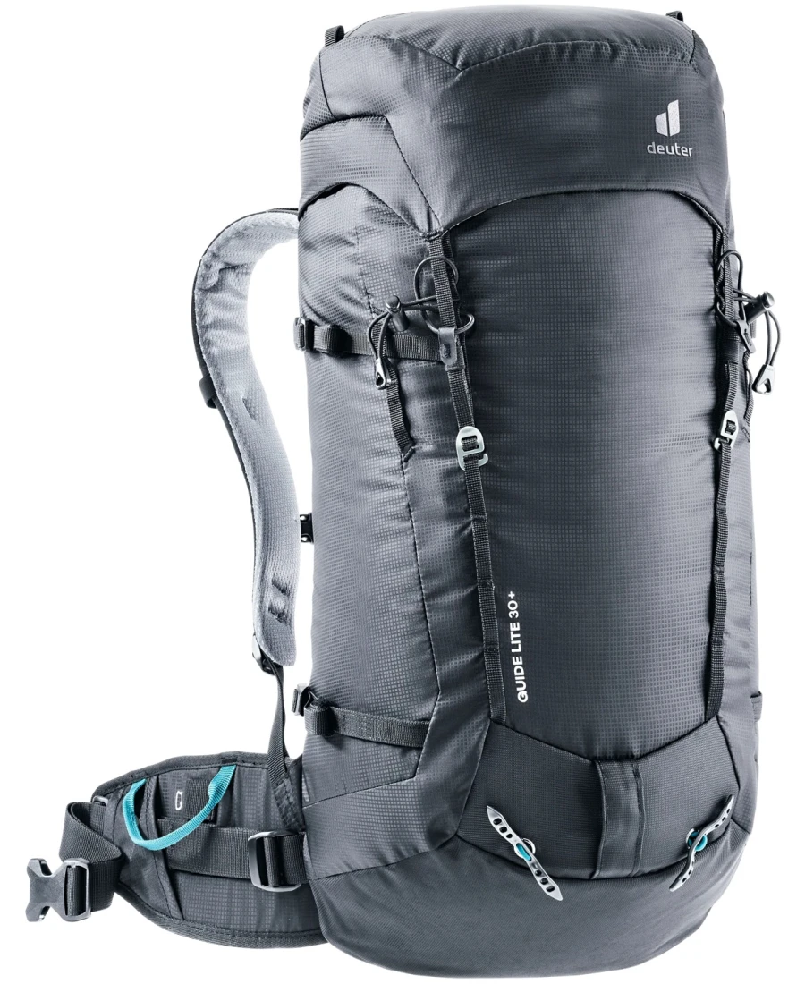 Zahlreiche und hilfreiche Befestigungsmöglichkeiten, wie Pickelhalterung, verstärkte Skihalterung seitlich, eine Funktionleiste vorn usw. machen den Guide Lite 30+ von Deuter zu einem schnörkellosen, leichten und robusten Begleiter bei Ski- und Bergtouren.
