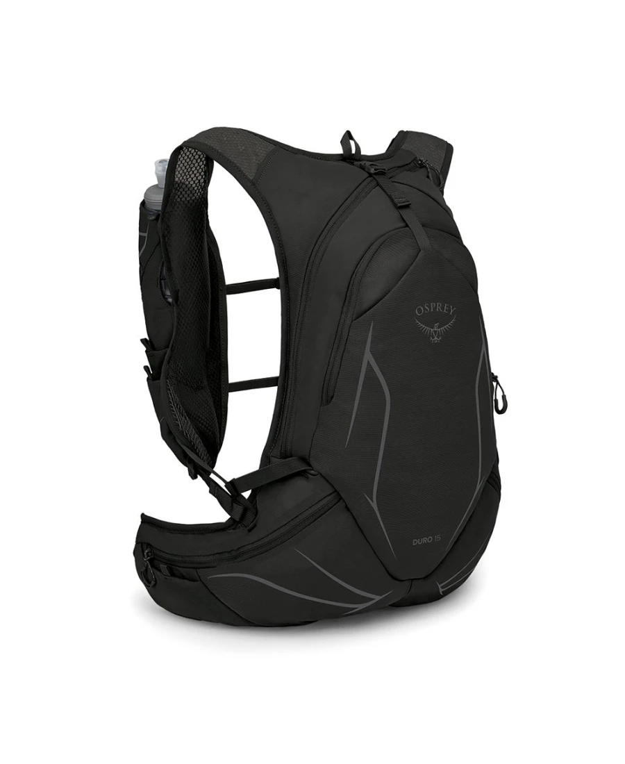 Der Duro 15 von Osprey wurde für Hochleistungs-Läufe und Trailrunning entwickelt, denn mit seinem Fassungsvermögen von bis zu 15 Liter bietet er genügend Stauraum für Getränk, Bekleidung, Proviant und Ausrüstung. Der leichte komfortable Trailrunningrucksack verfügt dank Hüftgurtflossen und Westen-Schnitt über hohen Tragekomfort und einen körpernahen Sitz. Das Tragesystem des Laufrucksacks besteht aus einem hautverträglichen Mesh-Netzstoff, das macht den Duro 15 extrem bequem und atmungsaktiv, auch wenn es richtig zur Sache geht. Mehrere Stretchmesh- und Reißverschluss-Fächer vorne an der Weste und am Hüftgurt ermöglichen auch während des Laufens einen leichten Zugang zu Ausrüstung und Proviant.