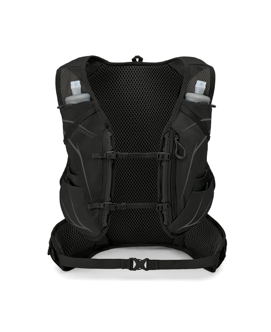 Die oberen Fächer an der Weste des Duro 15 von Osprey beherbergen zwei 500ml Soft Flasks, flexible Trinkflaschen, die dank ihres verlängerten Schlauches und Beißventils das Trinken während des Laufens leicht machen. Ein internes Trinkblasenfach macht es möglich eine Trinkblase im Rucksack mitzunehmen, falls man an heißen Tagen oder während langen Läufen zusätzliche Flüssigkeit benötigt. Das Fach ist mit sämtlichen Ospreys Hydraulics LT Trinkblasen kompatibel.