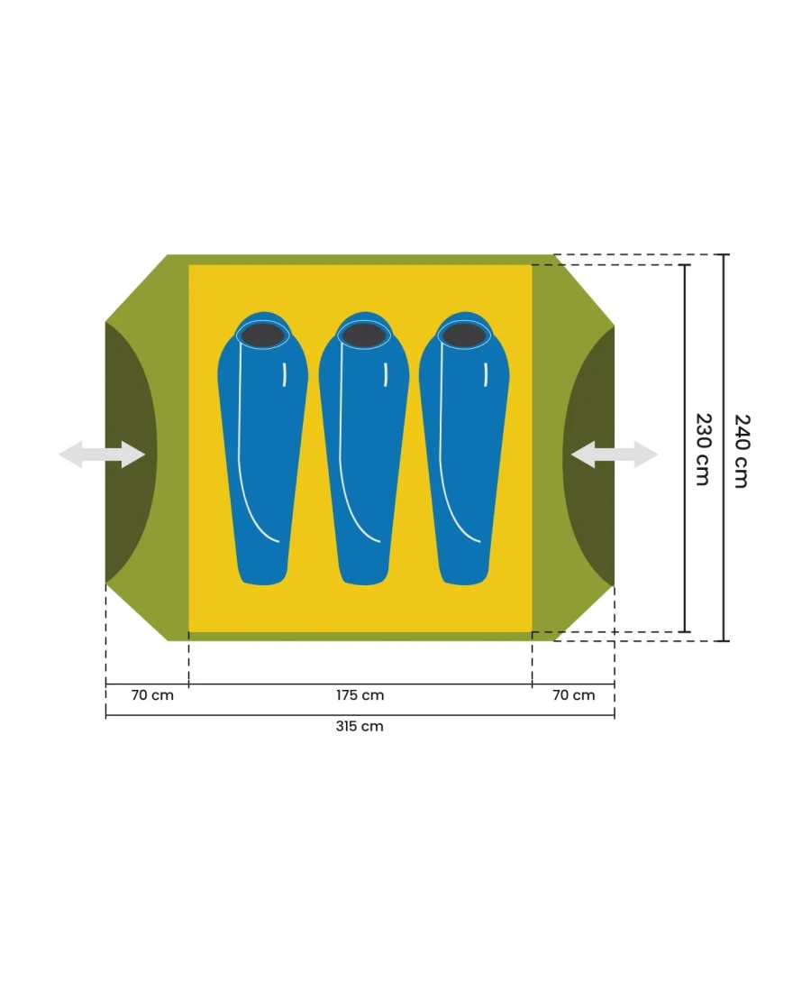 - Außenzelt: 315 x 240 x 120 cm (L x B x H)