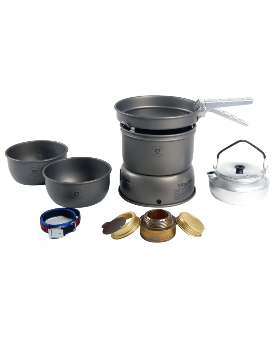 Die Serie 27 umfasst Kocher für ein oder zwei Personen mit kleinerem Kochgeschirr. Dieses kompakte Kochset fordert nur minimalen Platz im Rucksack. Mit hochgeklappten Halterungen im oberen Windschutz lässt sich der Kocher mit größeren Töpfen aus dem Trangia Sortiment benutzen.