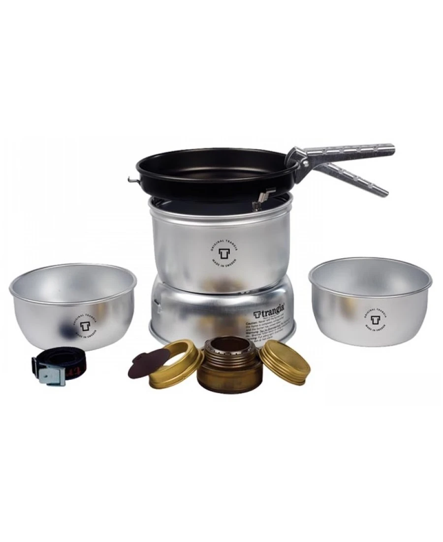 Die Serie 27 umfasst Kocher für ein oder zwei Personen mit kleinerem Kochgeschirr. Dieses kompakte Kochset fordert nur minimalen Platz im Rucksack. Mit hochgeklappten Halterungen im oberen Windschutz lässt sich der Kocher mit größeren Töpfen aus dem Trangia Sortiment benutzen.