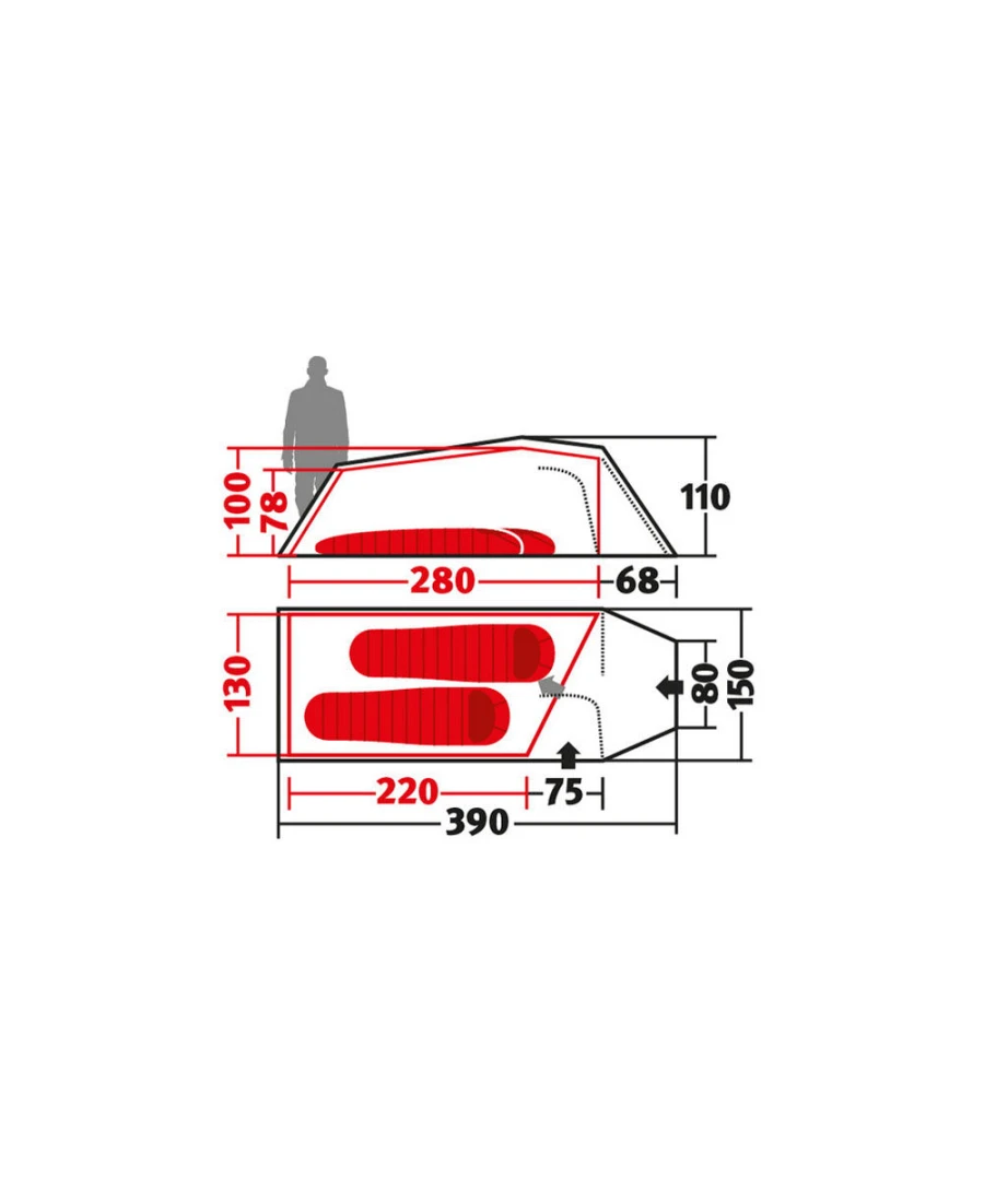 Obwohl beim Tempest 2 nicht auf Komfort verzichtet werden muss, ist es ein Leichtgewicht. Durch den asymetrischen Schnitt des Innenzeltes am Eingang ensteht eine sehr lange Liegfläche auf einer Seite, geeignet für Körpergrößen über 2m.