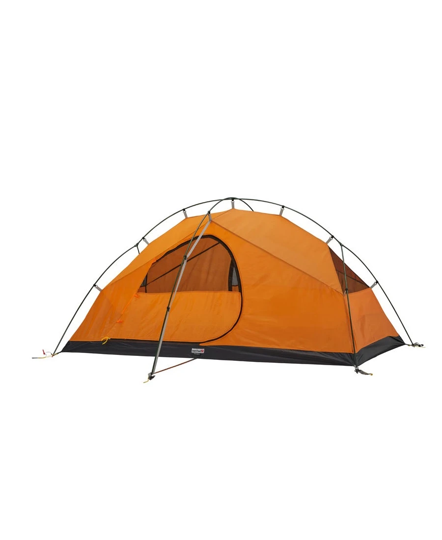 Das Venture 2 von Wechsel ist ein freistehender Geodät für zwei Personen – inklusive zwei Apsiden. Zwei Aluminium-Knotenpunkte am Gestänge sorgen für eine gute Windstabilität. Das Innenzelt des Venture wird zuerst aufgebaut. Der zusätzliche Gestängebogen bildet die Apsis, sobald das Außenzelt drüber gespannt ist. Für einen leichten Wetterschutz kann das Außenzelt mithilfe des Groundsheets allein aufgestellt werden. Das Innenzelt ist in den Türen sowie am Fuß- und Kopfende mit Mosquitogazen ausgestattet. Drei zusätzliche Innenzelttaschen sorgen für Ordnung und bieten Platz für sonst herumliegenden Kleinkram.